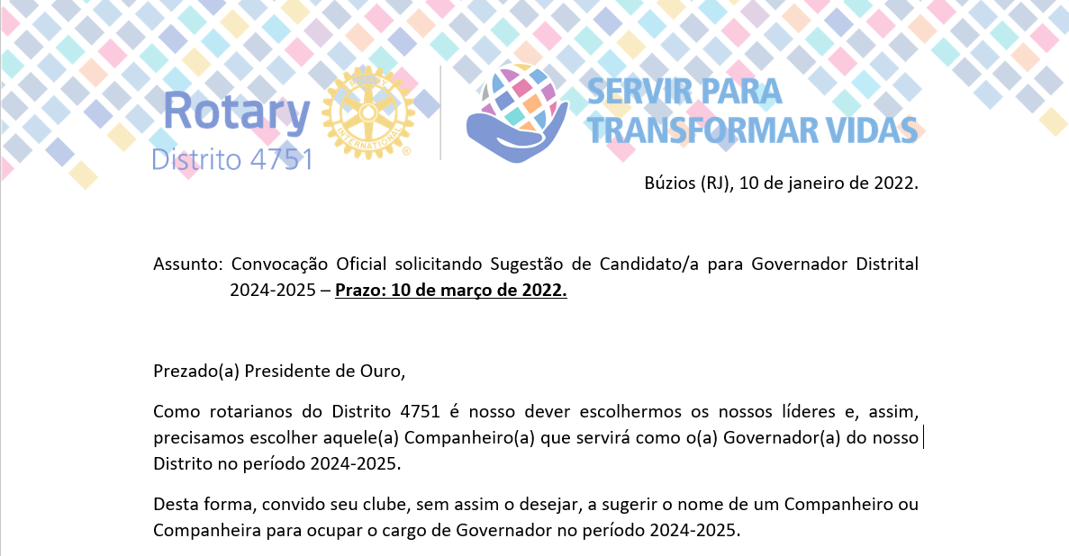 Convocação Oficial solicitando Sugestão de Candidato/a para Governador Distrital 2024-2025 – Prazo: 10 de março de 2022.